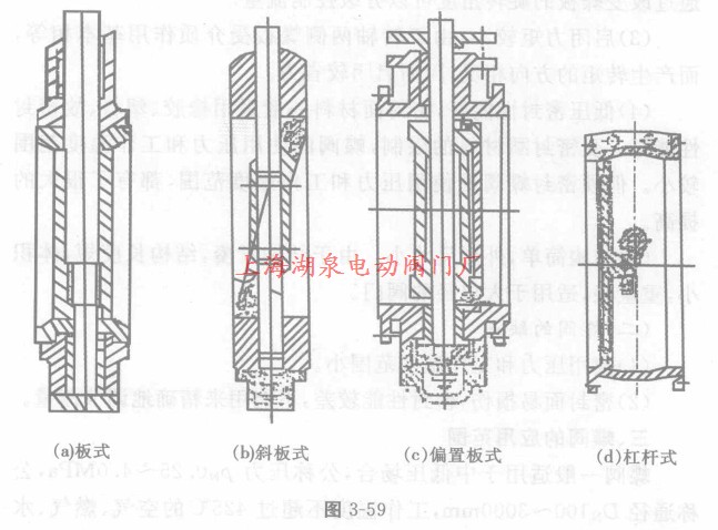蝶閥根據(jù)連接方式分為:法蘭式、對夾式,如圖3—58(a)和(b)所示;根據(jù)密封面材料分為:軟密封、硬密封;根據(jù)蝶板在閥體中的安裝方式,蝶閥可分成:板式、斜板式、偏置板式、杠桿式。如圖3-59所示。
